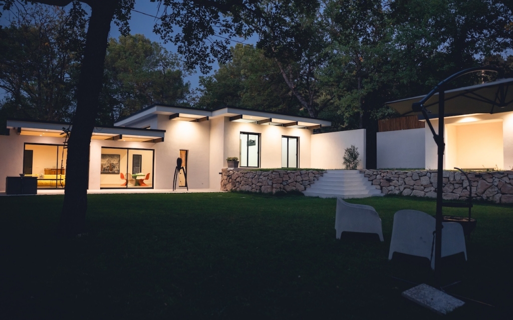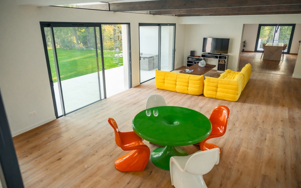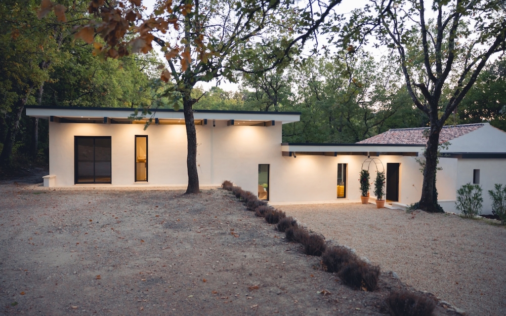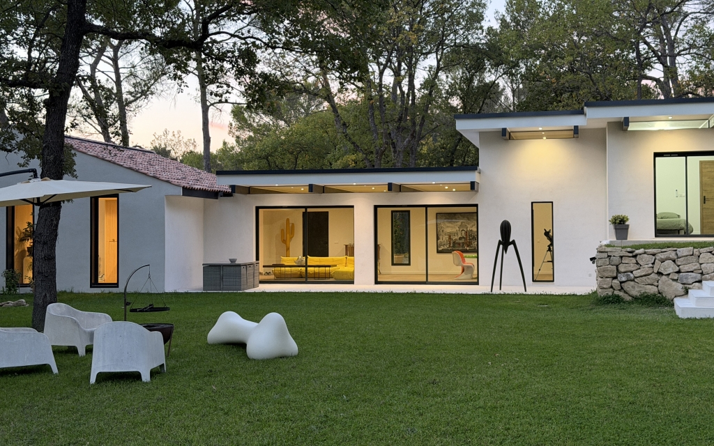 Modern architectural codes are everywhere: overhangs protect the immaculate façades, while roof-level openings recall the work of Jean Prouvé or Le Corbusier. The flat wooden roof extends seamlessly from the original Provençal tiled roof — a perfect blend of modernity and local vernacular style. The natural slope of the land has been preserved, with landscaped terraces offering multiple relaxing outdoor spaces.