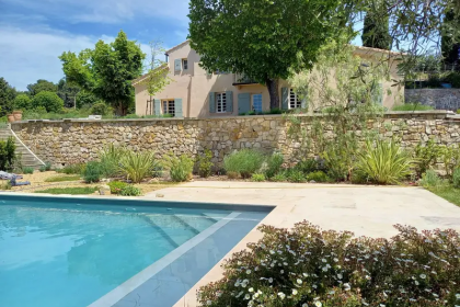 Ancien domaine viticole entièrement rénové, la propriété se déploie sur un parc paysagé d’un hectare, ponctué de beaux arbres et d’essences méditerranéennes, avec une vue dégagée sur le Luberon.