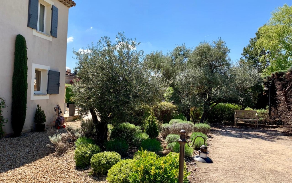 The garden, beautifully planted with Mediterranean species, features a traditional 8 x 4 m swimming pool with pool house (Jacques Brens model).