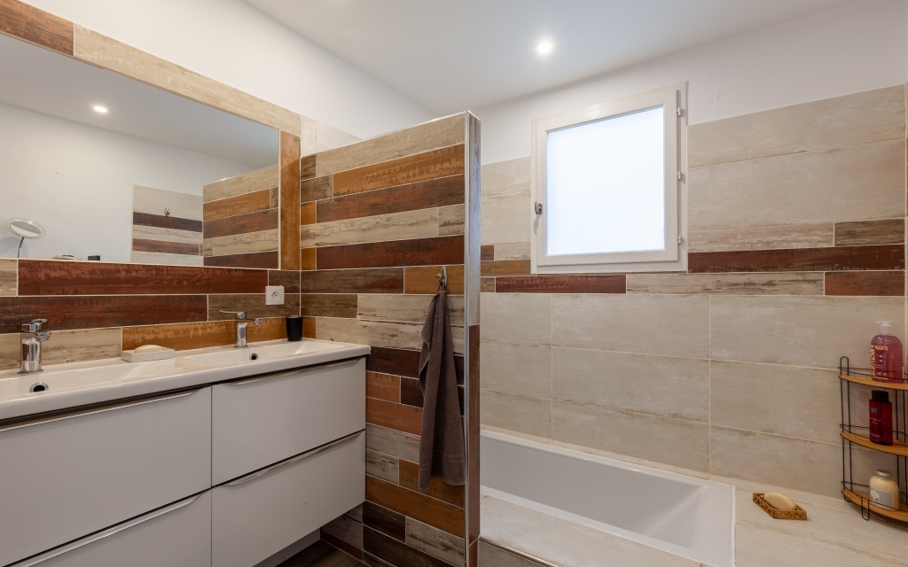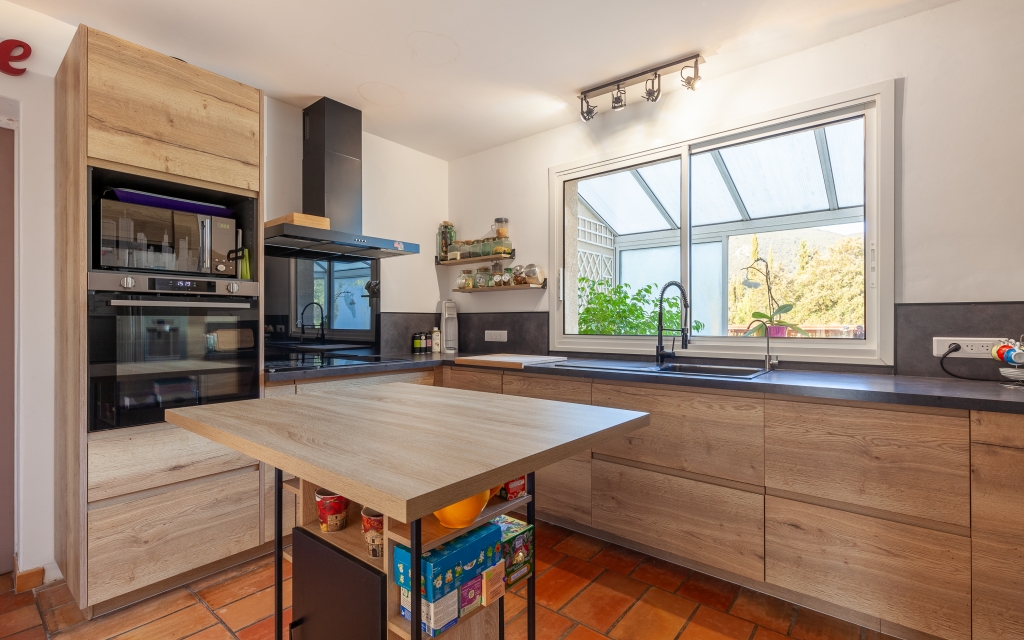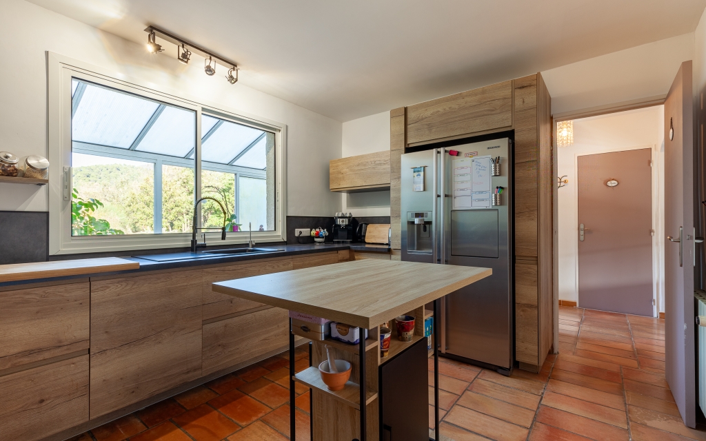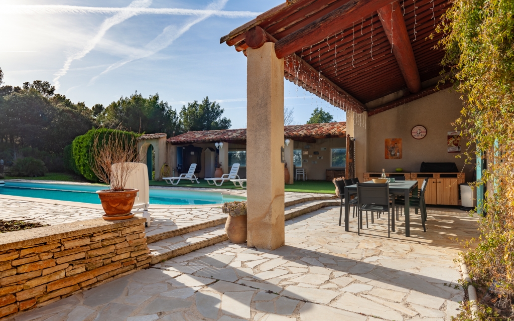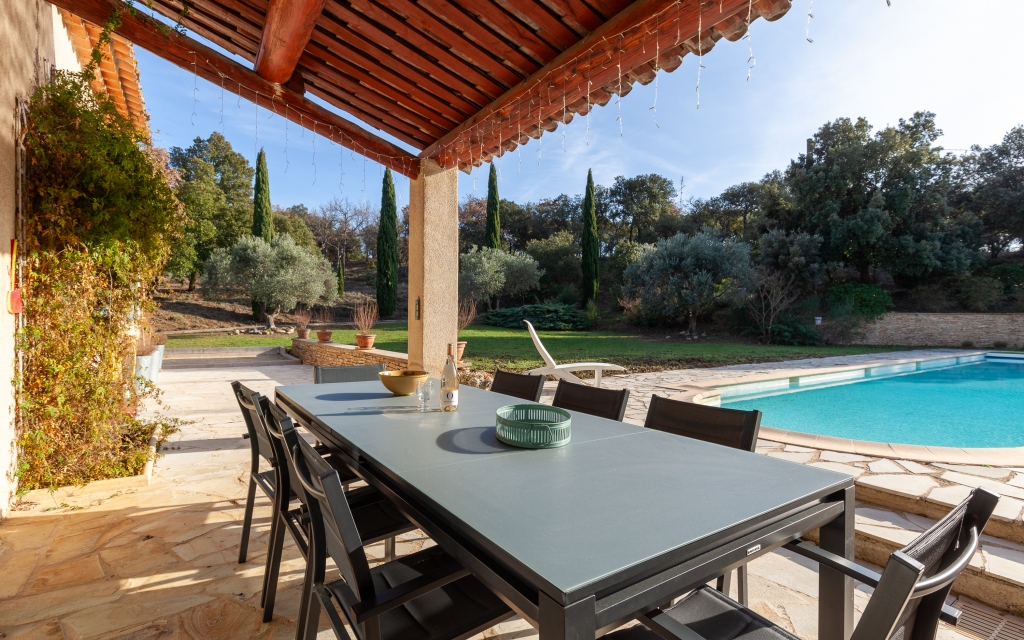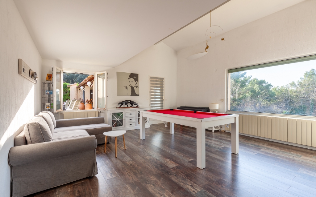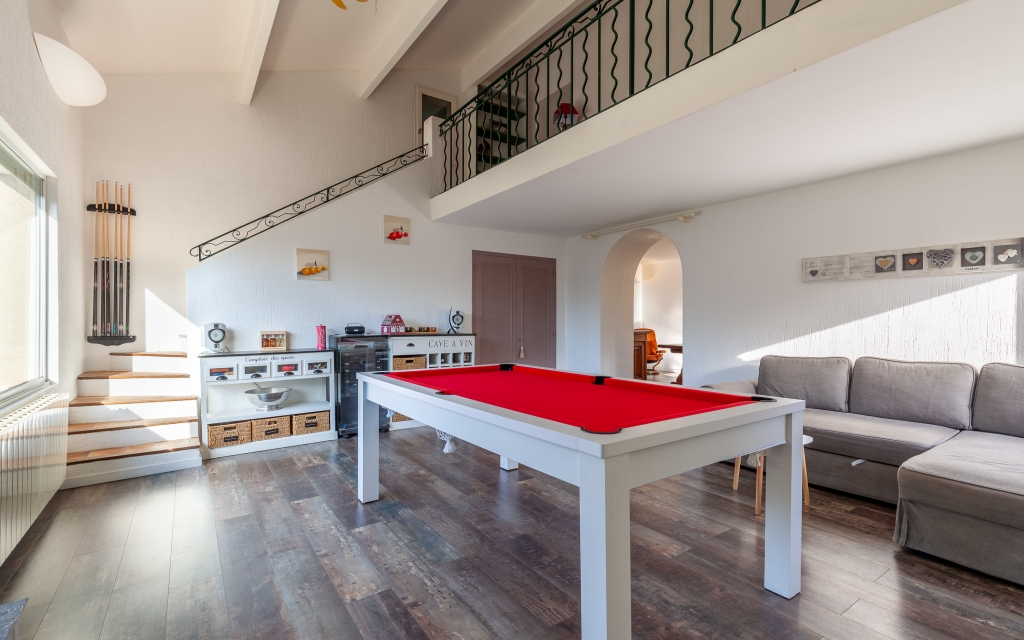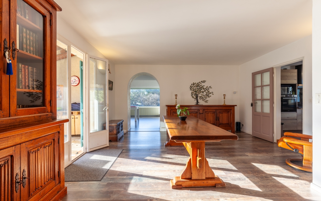 The living areas include a double living room with fireplace opening onto a south-facing terrace and the swimming pool, a summer dining room under a canopy, a recently fitted and fully equipped kitchen with central island, a second bright west-facing living room, a mezzanine, as well as three bedrooms, a bathroom and a shower room.