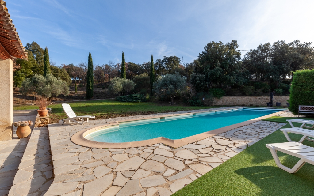 The swimming pool (17 m x 4m), surrounded by large sunbathing areas, blends harmoniously into the garden and benefits from a shaded area ideal for relaxation.